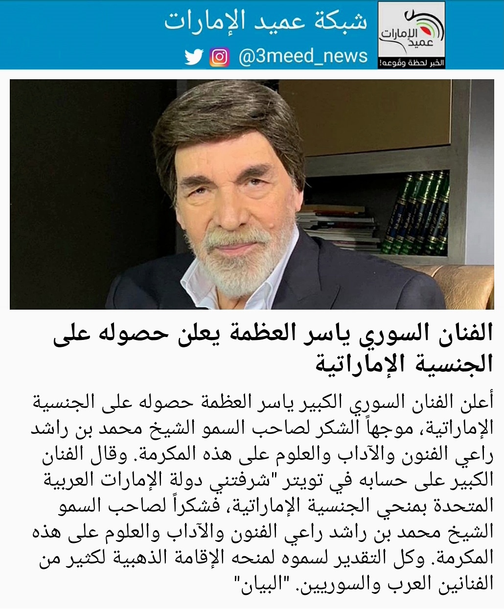 شبكة عميد الإمارات Ar Twitter الفنان السوري ياسر العظمة يعلن حصوله على الجنسية الإماراتية عميد الإمارات